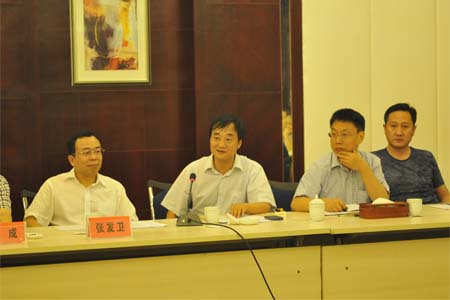 枝江酒业董事长蒋红星(左二)在会上发言 7月5日,宜昌市工商联合会主席张发卫一行到枝江酒业参观,市工商联(总商会)各副主席、副会…
