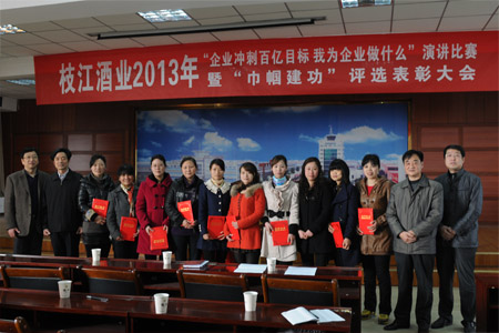 受表彰的先进女职工和公司领导一起合影 3月5日,枝江酒业组织开展了庆“三八”系列活动。表彰了一批获得2012年度“巾帼建功”先进个人,开…