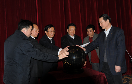 总经理张春雷(左三)与荆州市领导共同启动水晶球 3月29日,枝江酒业与荆州新视界农村电影院线公司联手,正式启动“知心知己枝江酒,…