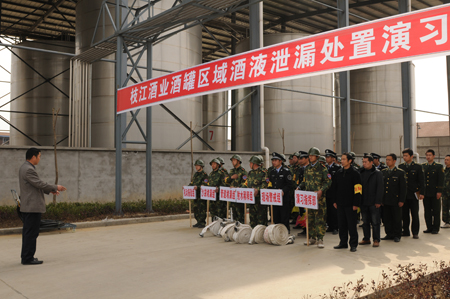 3月17日下午3时,在枝江酒业新竣工投产的2万吨基酒车间储酒库,枝江酒业2011年度首次消防演习如期举行,此次演习围绕“酒罐区域酒液泄露处置…