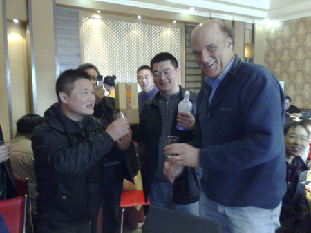 3月12日中午,枝江酒业汉办销售人员在武昌水果湖双湖园酒店招待客户吃饭,巧遇武汉大学的几个外国教授在一旁吃饭。同室进餐,大家相互点头致…