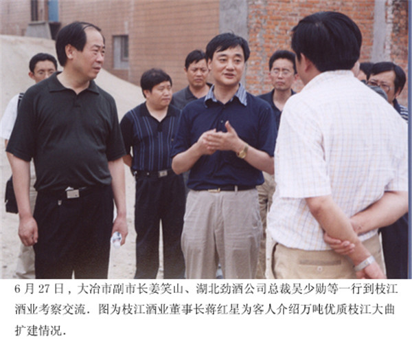 6月27日,大冶市副市长姜笑山、湖北劲酒公司总裁吴少勋等一行到枝江酒业考察交流。图为枝江酒业董事长蒋红星为客人介绍万吨优质枝江大曲扩建工…