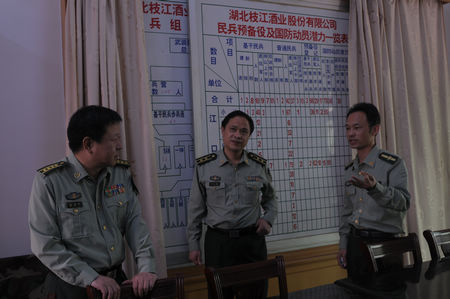 5月8日,宜昌军分区司令员孟春林一行在枝江市人武部部长胡文雄、政委邓正平等人的陪同下到枝江酒业检查指导民兵组织整顿工作,基层组织建设工作。枝江酒业党委书记张华、副总经理刘前生对来访领导给予了热情接待,并陪同参观了枝江酒业展厅、包装车间、酿造车间。