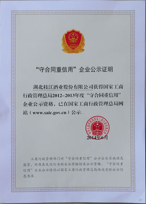 1月20日,宜昌市工商局、枝江市工商局领导为枝江酒业送来“国家工商行政管理总局2012-2013年度守合同重信用企业”、“湖北省2012-2013年度守合同重信用企业”2项荣誉证书。这是枝江酒业继2010-2011年度后再度被授予该称号。国家级守重企业是全国企业信用评价的最高荣誉,也是枝江酒业继2014年11月被湖北省人民政府表彰为省级“守合同 重信用”示范企业后,获得的又一项重量级荣誉。