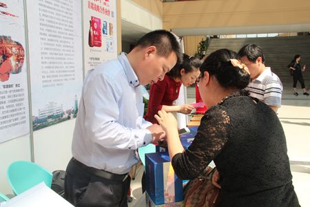侯先圣副总经理在产品展示处与前来咨询的客户交流