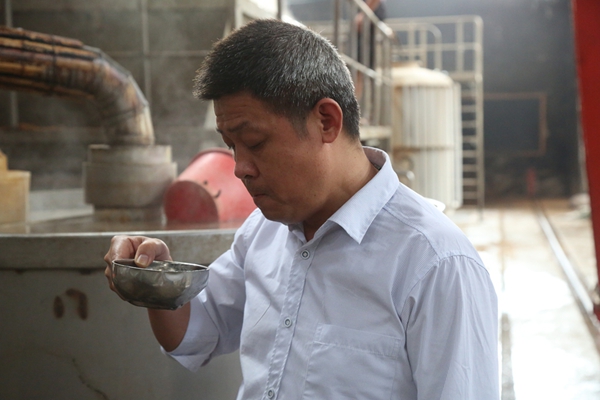 酿造五车间主任董明喜(中),2013年入党。“酿酒也如做人。”