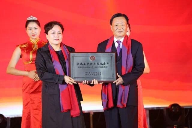 宜昌市非遗中心主任林鸿为枝江酒业授予湖北省第五批非物质文化遗产保护名目的匾牌